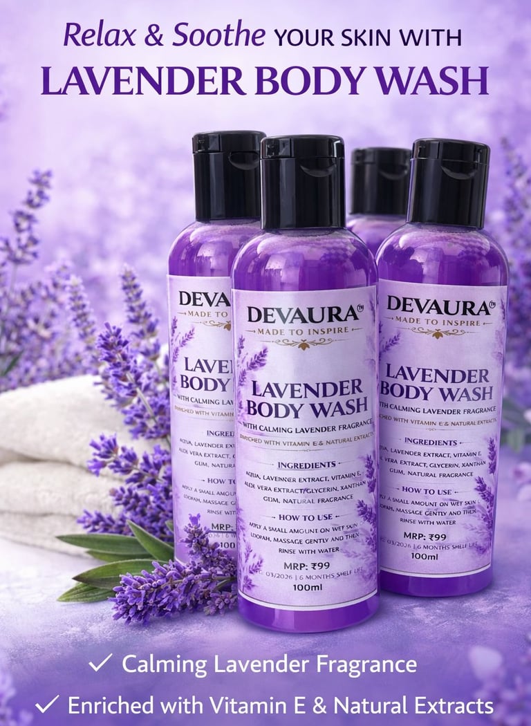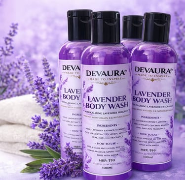 We believe that everyday luxury should be within reach. Proudly "Made in India," the Devaura Lavender Body Wash comes in a convenient, travel-friendly 100ml bottle. At a highly accessible MRP of just ₹99, it delivers a premium, high-quality cleansing experience without the premium price tag. Furthermore, with a specialized six-month shelf life, you are guaranteed a product that relies on the fresh potency of its natural ingredients.