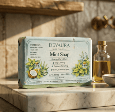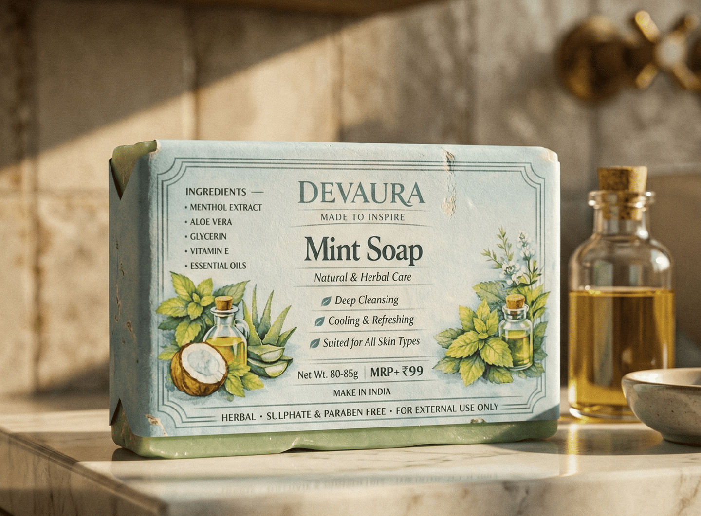 "Imagine the crisp air of a Himalayan morning, distilled into a single bar of soap. Experience the Devaura Chill."